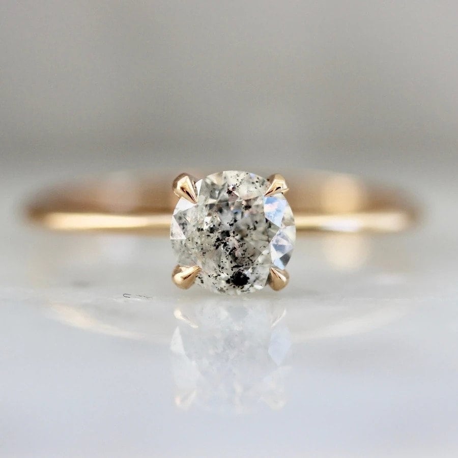 This ring packs a personality filled punch at 1.02 carats of ethereal salt & pepper beauty featuring the perfect amount of sparkle and lightness, this diamonds glows in its Stella setting. With an unmatched unique pattern of inclusions, this ring is a true unicorn. Baby claw prongs and our exclusive 18k Peach Gold finish off this stunning alternative engagement ring.