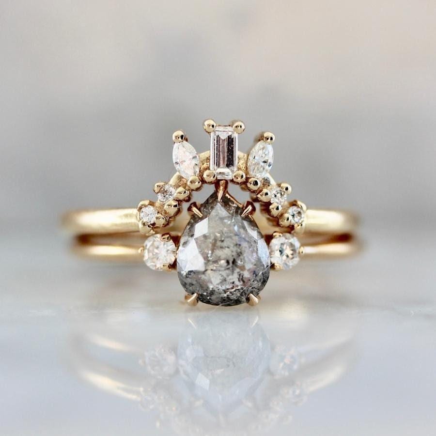 The center stone of this ring is a salt & pepper pear rose cut diamond that is perfectly spready and has a gorgeous dispersement of pepper. A pair of perfectly matched, high quality round white brilliant cut diamonds are set on either side, and all secured with petite claw prongs. Set in our exclusive 18k Peach Gold and stackable with a slim band.