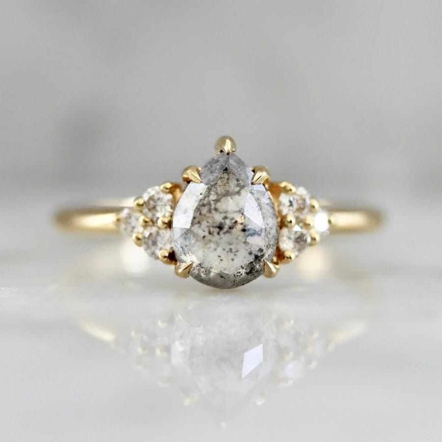 The center stone of this ring is a salt & pepper pear rose cut diamond that is perfectly spready and has a gorgeous dispersement of pepper. A trio cluster of high quality round white brilliant cut diamonds are set on either side, and all secured with petite claw prongs. Yummy 18k Yellow Gold finishes off this piece that sits low and flush to the finger.