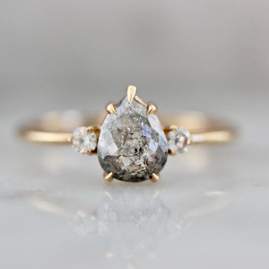 The center stone of this ring is a salt & pepper pear rose cut diamond that is perfectly spready and has a gorgeous dispersement of pepper. A pair of perfectly matched, high quality round white brilliant cut diamonds are set on either side, and all secured with petite claw prongs. Set in our exclusive 18k Peach Gold and stackable with a slim band.