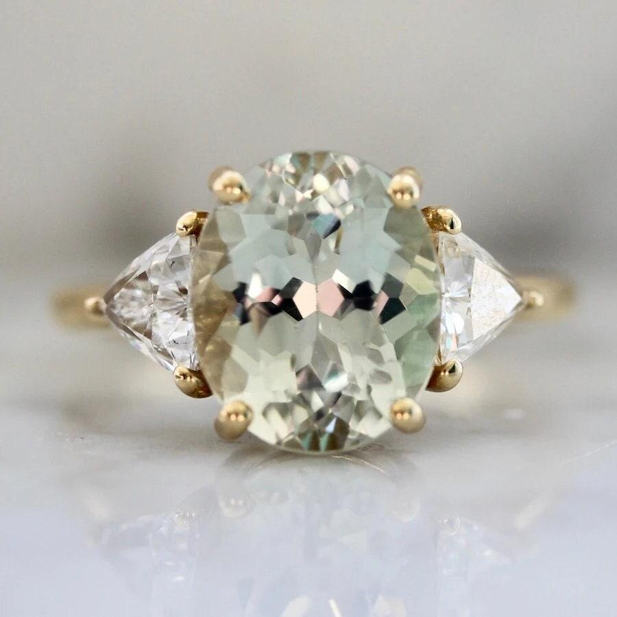 This divine light yellow-green oval cut tourmaline is the perfect choice for those looking for a statement piece. She is spready at four carats of pure deliciousness and accented by two bright white trillion cut diamonds, and all wrapped in 18k Yellow Gold. Rock her as an alternative engagement ring or as a right hand ring for the days that you want just a little extra something.