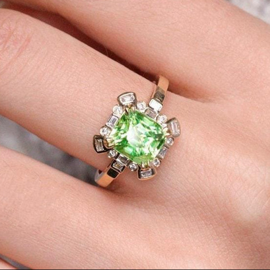 • Center Stone: Natura Demantoid from Ural Mountains, Cushion Cut, Approx 3.05ct