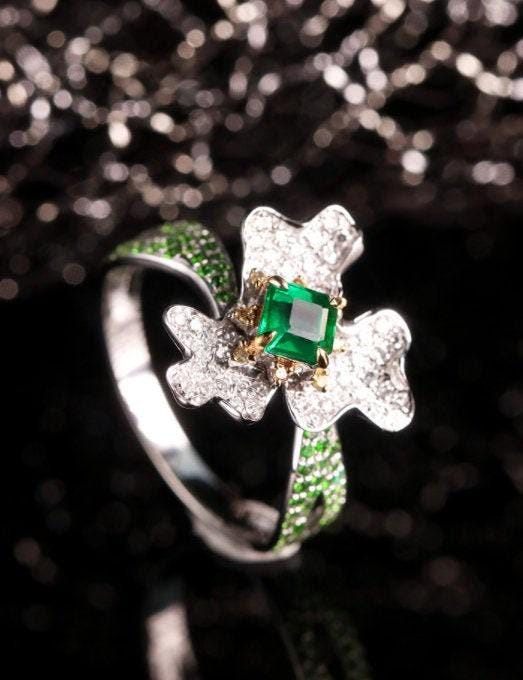 • Center Stone: Natural Vivi Green Emerald, Square Cut, 0.4ct, 8x6mm