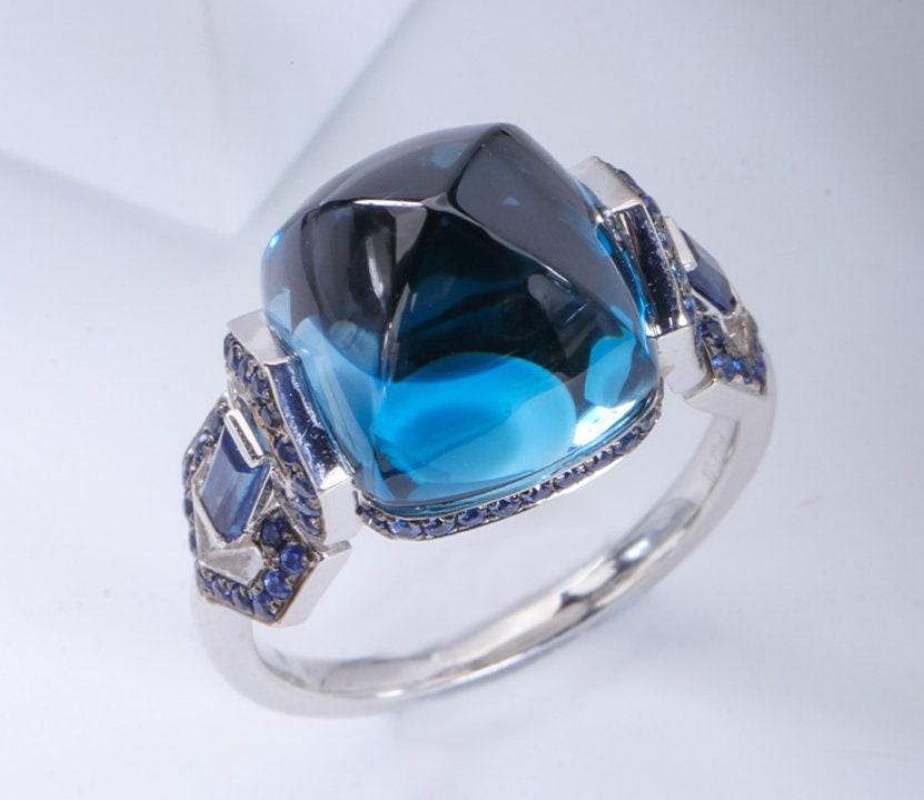 • Center Stone: Natural London Blue Topaz, Sugar Loaf Cut, Approx 12.12ct total