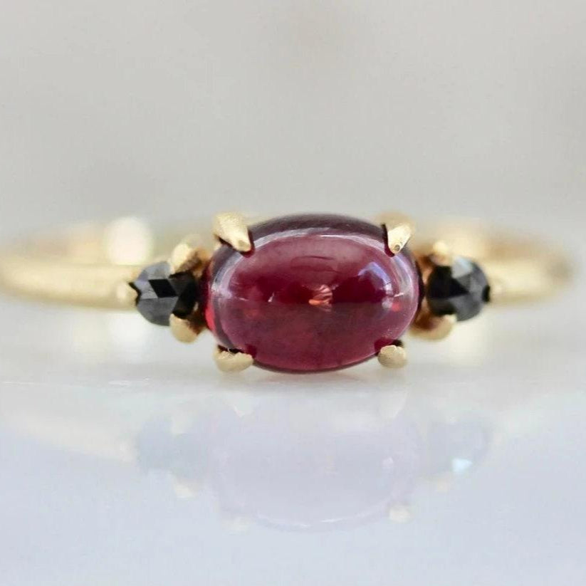 It's no secret we live for alternative rings and this one is so swoon-worthy! A glowing orb of a cabochon rhodolite garnet is set east-west in the center with black rose cut diamond side stones on either side. She sits low to the finger and is finished in 14k Yellow Gold, claw prongs and a slim band.