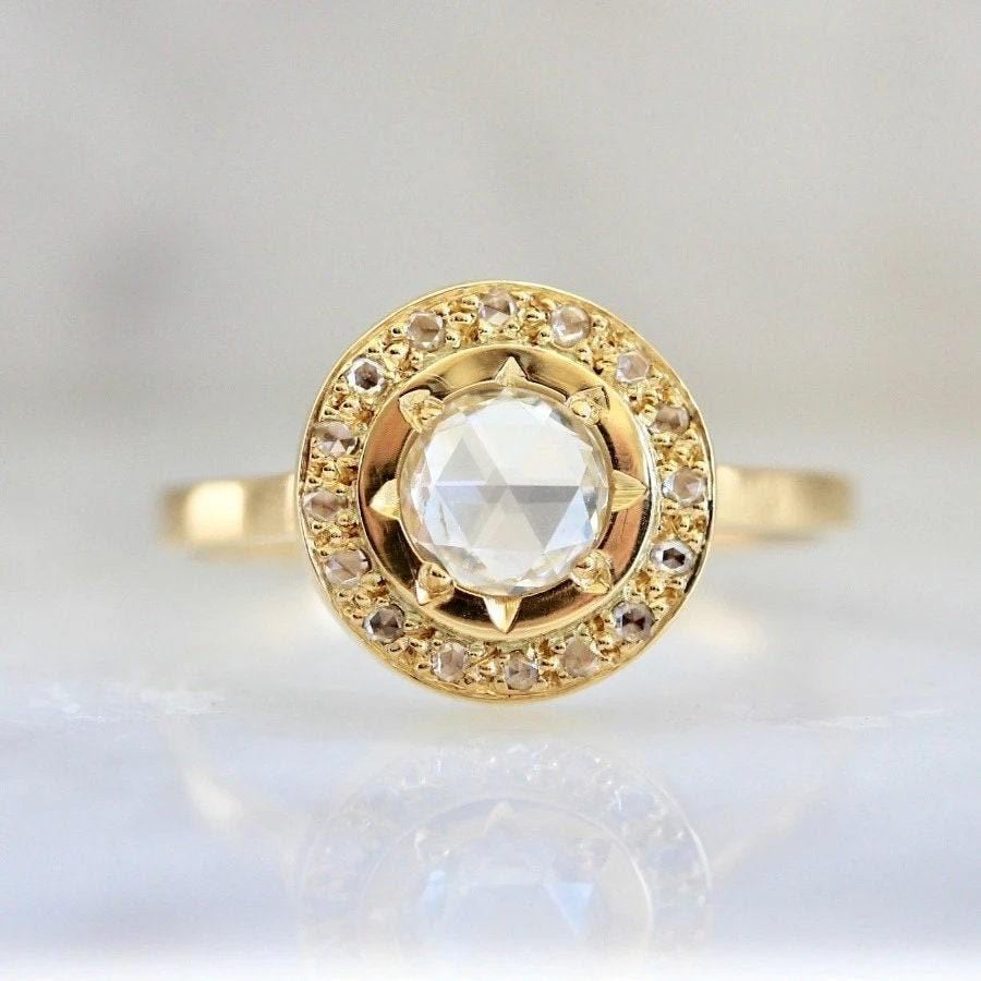 Start your day feeling like the queen you are with this elegant piece! Featuring a glittering white round rose cut diamond and paired with a halo of complementary stones. This perfectly alternative engagement ring is complete with a gorgeous detail of a symbbolic sunburst motif circling the center stone. Finished off with recycled 18k Yellow gold, this ring is also stackable with a slim band.