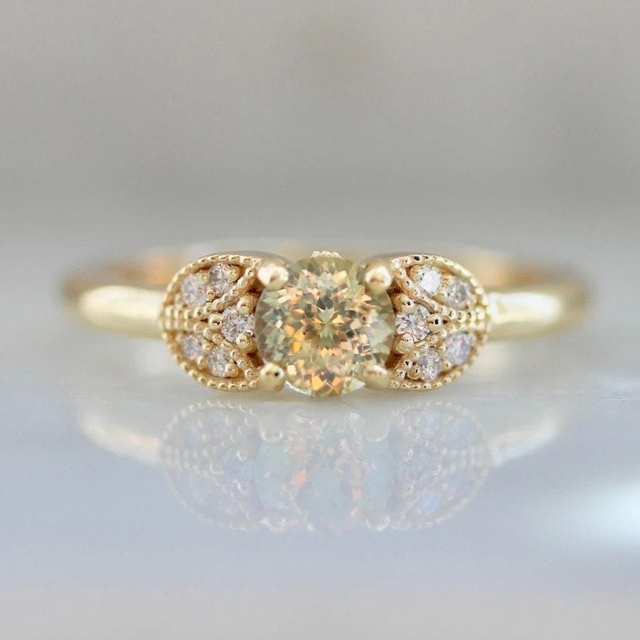 This vibrant yellow round brilliant cut sapphire is perfectly buttery and downright mouthwatering. Set between leafy shoulders studded with bright white round brilliant cut diamonds and milgrain detail, this ring has no shortage of personality. Finished in luscious 18k Yellow gold and a plain gold band, she is low profile and would look divine paired with a curved band.